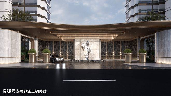 主出入口整体长约30米,进深约23.5米,将顶部廊架扩展到到中岛以外,彰显大气的特色。挑高金属雨棚采用极细边,中间凿壁采用透光奢石,搭配极具现代主义的雕塑彰显小区档次,背景墙面采用维多利亚黑大理石,奢华且低调。