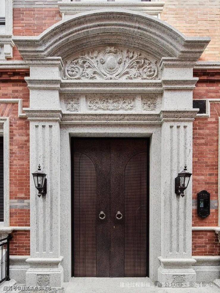 定制级山花造型,取材珍稀玫瑰金麻花岗岩,在坚硬的石面之上,勾勒出层层叠叠的雕花肌理;