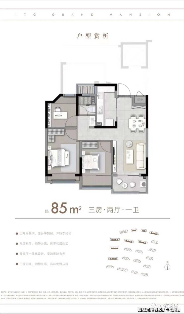 户型解析:约85㎡的3房,这种入门级的产品也要保证居住的尺度感。比如利用L形厨房与餐厅相连接,一体化的设计让空间充足利用。比如次卧连接阳台,就是人性化考虑到给他们一个私密的追光天地。