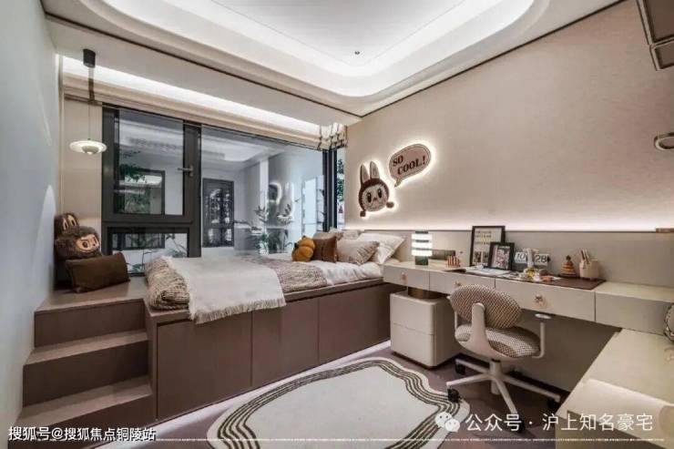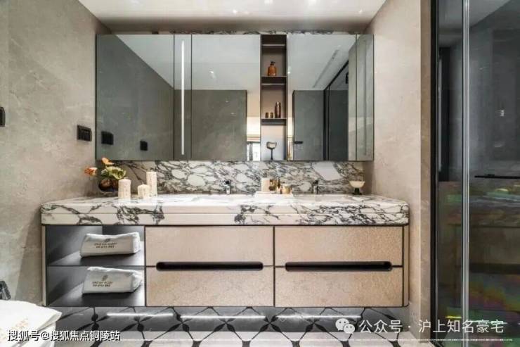 另外采用意大利 “大花白” 天然石材实现地墙满铺,双台盆与双镜柜的对称设计复刻五星酒店规制,美妆冰箱精准控温呵护护肤品,奢华至极!