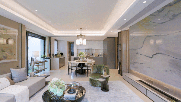 位于5号楼楼王位置的约220㎡四居是顶豪家庭的终极之选。270°景观舱式设计,结合超大面宽阳台,形成了连续四个开间的奢华南向景观面。