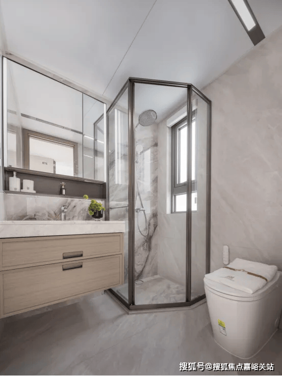 主卫生间配备了智能化的魔镜,该镜面为双面高清设计,内置美妆冰箱功能的镜柜以及卫浴柜,能够实现恒温冷藏。主墙面装饰采用了耐用的岩板材料,内部设计考虑周到,特别预留了四个电源插座,方便电动牙刷、卷发棒以及吹风机等个人护理电器的使用和收纳,同时设有洗脸巾的抽取装置。