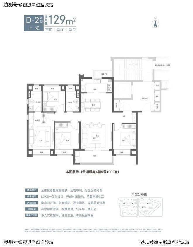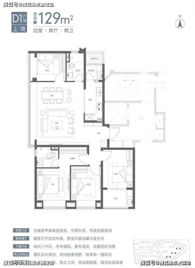 预算充足的小伙伴,可以选建面约129㎡4房,经典的三卧朝南、边套观景户型。