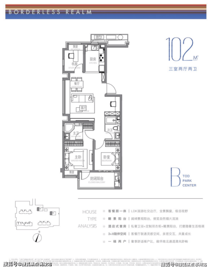 建面约102m²户型特点: LDK洄游式景观边厅,景致拉满,3+X陪伴空间,承载更多自定义功能需求,开放式厨房,烹饪与客餐厅无界互动。
