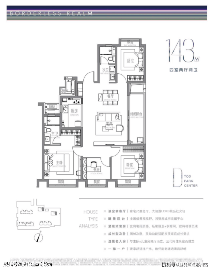 建面约143m²户型特点: 超大画幅的岛厅,大洄游LDKB公区格局,IMAX级景观阳台,超奢观景视野,一梯一户尊享级梯户比,南北通透,尊崇感十足!