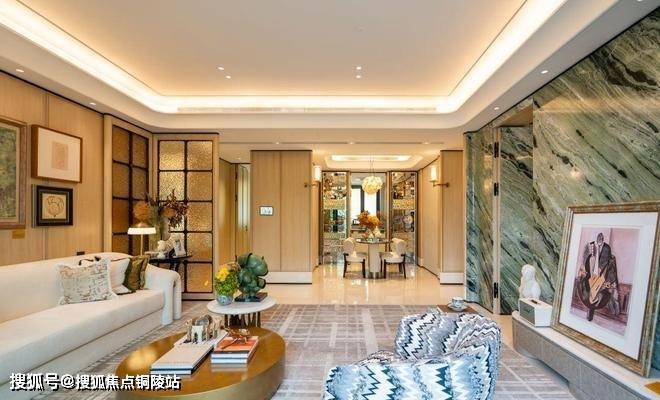 例如入户玄关铺设有“石材皇后”鱼肚印象,这种级别的奢石在很多顶豪项目中通常仅作局部镶嵌