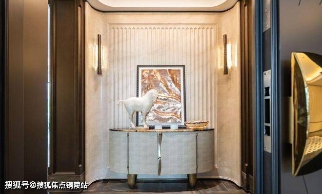 电梯厅的宠物识别按钮是艺术家定制款;入户门把手出自艺术家刘建华之手,用整块实心铜锭经锻造、打磨、电镀等多道精密工艺制成,握住的瞬间就是与艺术的触碰