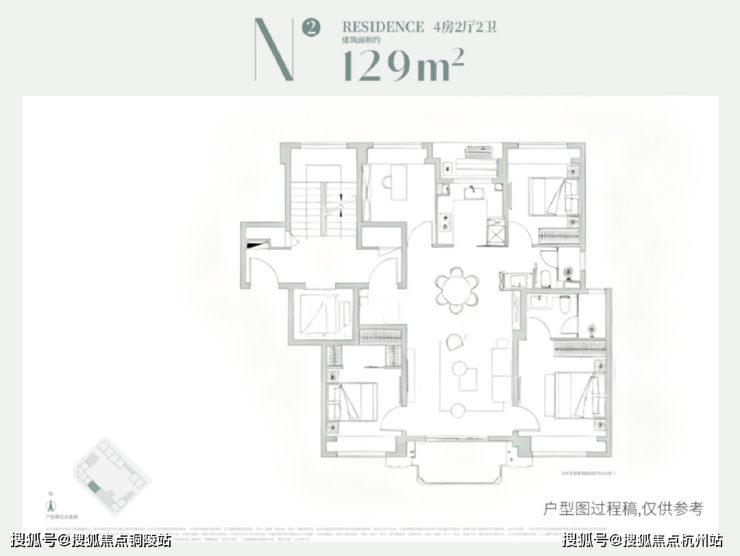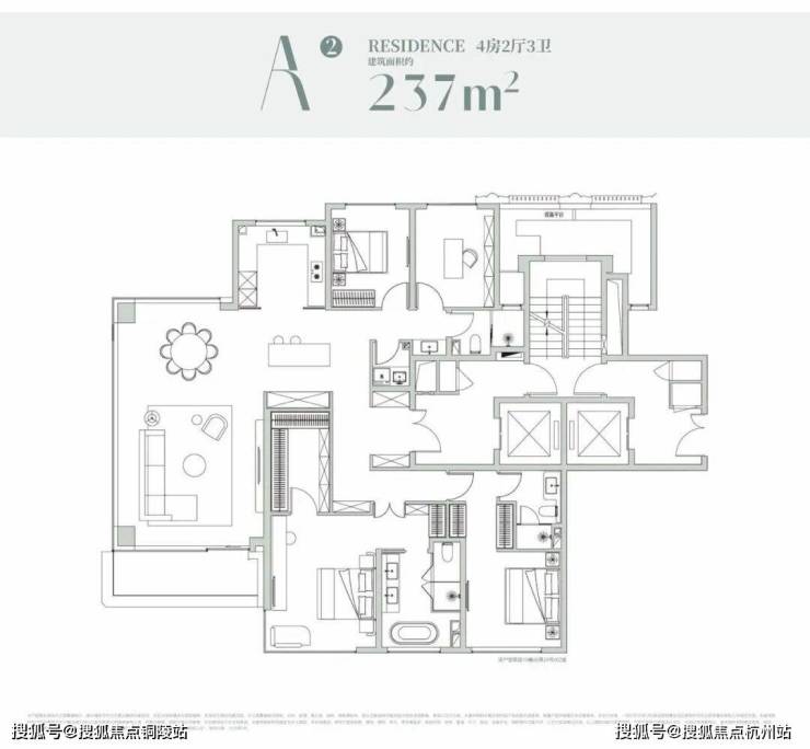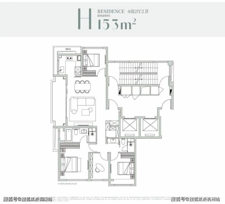 经典的四叶草布局,四开间分布在四角,兼顾私密与互动,是二胎家庭的优选。
