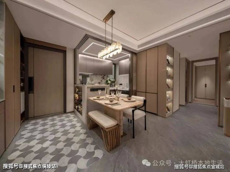 此外,项目全屋采用岩板铺装,从玄关、餐客厅到厨房、卫生间,抗污防潮好打理,银杏纹样拼花更添质感。