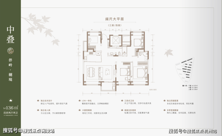 建面约 137 ㎡下叠, 四房两厅三卫 全能格局,非常适合二娃家庭以及三代同堂。