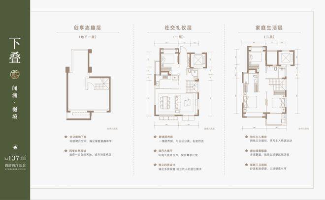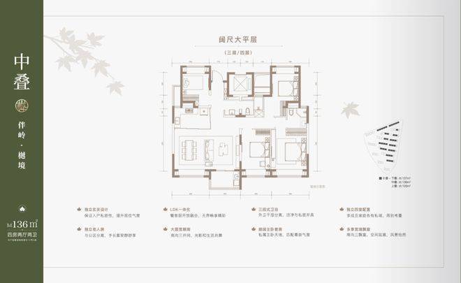 建面约137㎡下叠,四房两厅三卫全能格局,非常适合二娃家庭以及三代同堂。