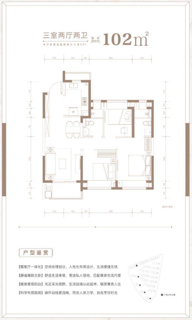 建面约102㎡3房2厅2卫户型,做到了三开间朝南+双朝南卧室带飘窗+动静分离+卫生间干湿分离,采光面拉到极致!是一个非常方正的户型。