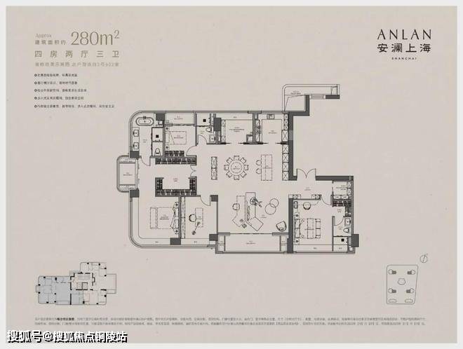 建面约280㎡4+1 房户型,以约72㎡LDKB一体化厅,家庭互动核心;环幕总面宽约51米,南向面宽达22米;主卧配套齐全:衣帽间+空中花园;灵动空间可改造,适应多元需求。