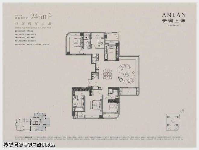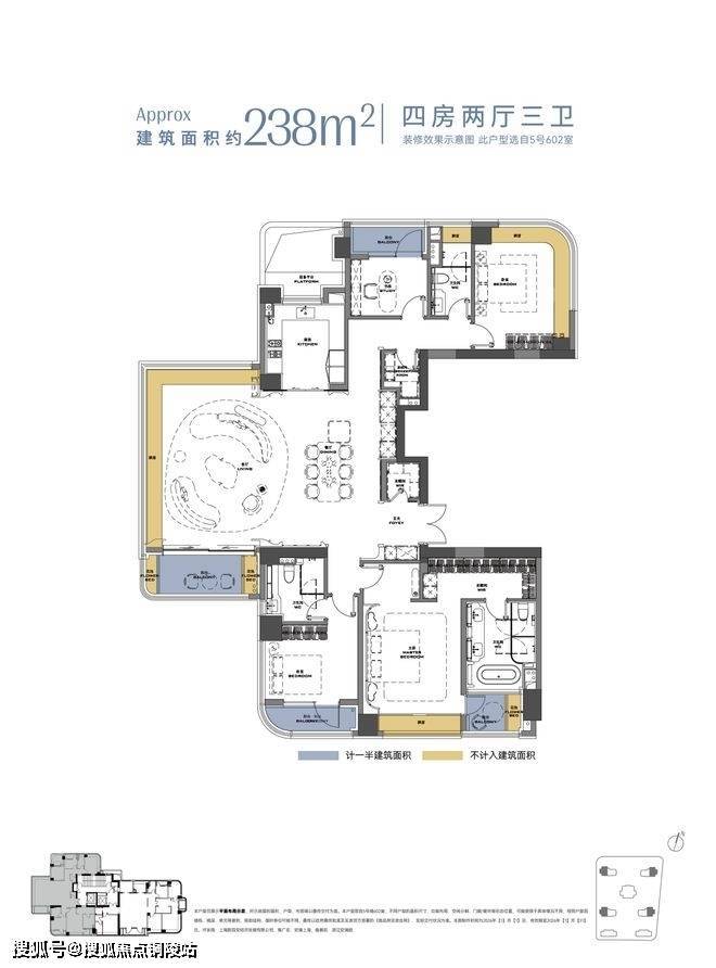 建面约238㎡四房三卫环幕全景舱户型,全屋约46 米全景采光周长,客厅打造连续约 17 米三面采光界面,成就 IMAX 级环幕视野,搭配3.45米奢阔层高,让自然光无死角渗透;朝南双主卧套房搭配全屋六大系统化收纳空间,兼顾家族居住的私密性。