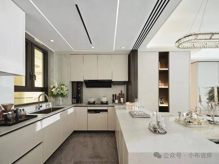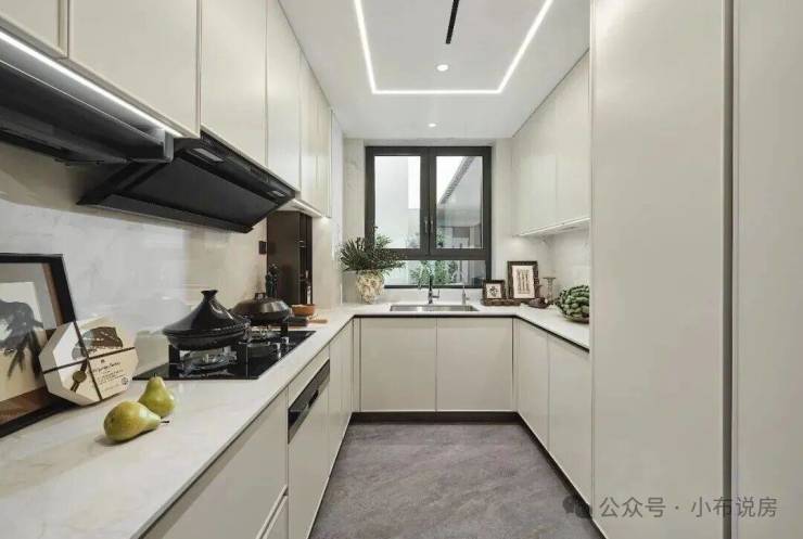 厨房配备西门子厨电、弗兰卡水槽;标准的U型布局,冰箱位置外置之后收纳空间全部做满,完全可以容纳2-3人一起操作,毫不拥挤。