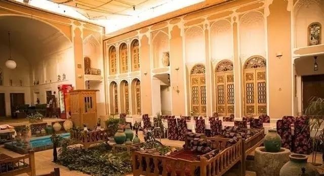 大大的庭院即是大厅也兼作餐厅。酒店的老板很热情,一见到我们就吩咐服务员为我们送上传统的伊朗红茶。我们被安排在二楼的房间,客房干净舒适,布置别致。据说其中一个房间还有自己的风塔,可惜我们没住在那里。正院有一个很受欢迎的茶室和能观赏风景的屋顶。