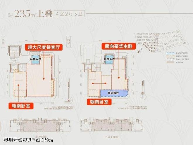 上叠功能性与下叠看齐,也是四个朝南的全明卧室,主卧豪华套房配置,外接南向超大露台,观星品茗无比惬意;