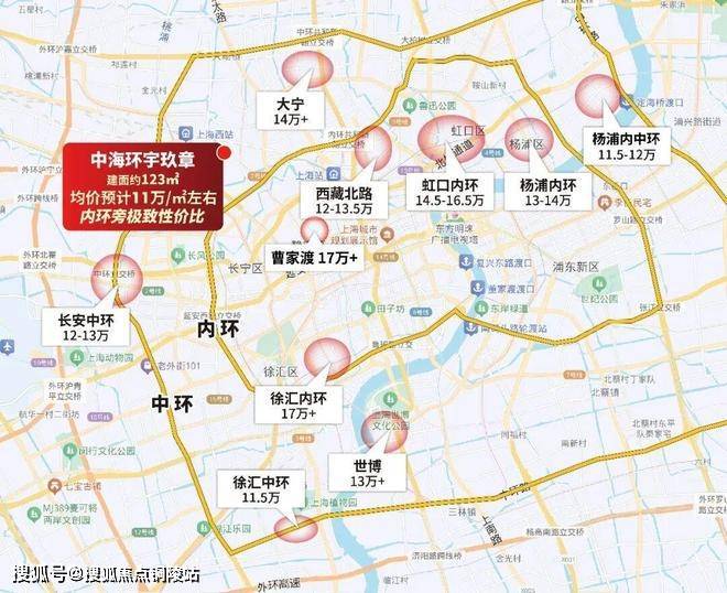 内环内新房普遍12万+/㎡,静安曹家渡约17万+/㎡、虹口14.5-16.5万/㎡;内中环如大宁14万+/㎡、长宁中环旁12-13万/㎡、浦东世博13万+/㎡。
