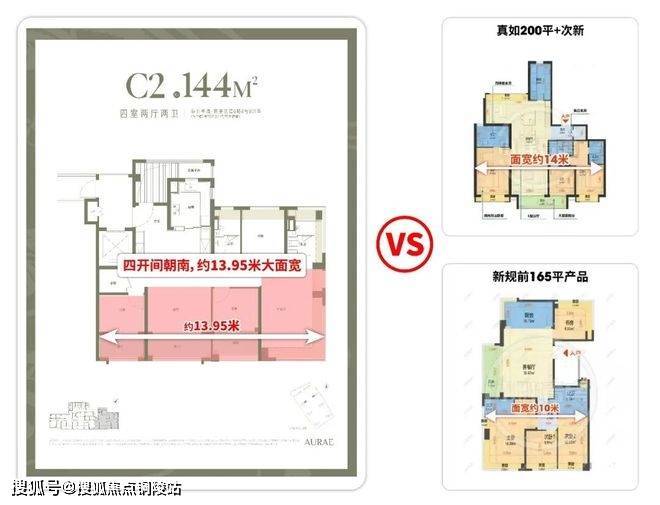 同面积段新规产品普遍仅三开间朝南、面宽约11米,本项目直接做到四开间朝南,面宽高达约13.4米。面宽属于后期无法改变的硬指标,带来的是更持久、更舒适的采光与视野升级。