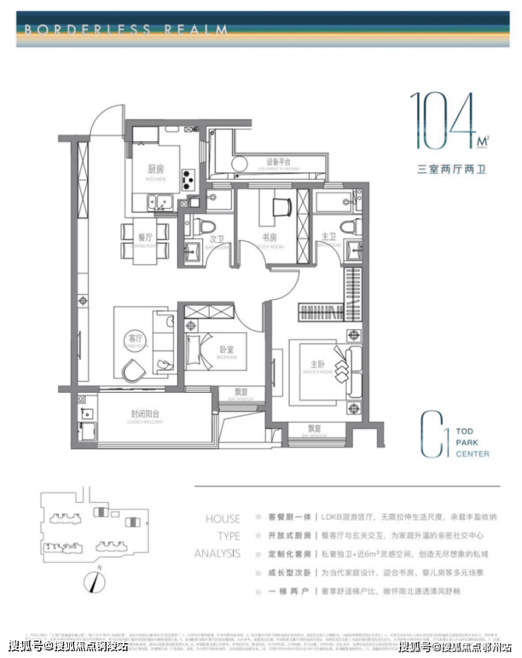 建面约104m²户型特点: LDKB洄游式竖厅+开放式厨房,生活尺度无限拉伸,主卧近6m²灵感空间,承载更多功能可能,成长型的次卧,书房儿童房随心所欲。