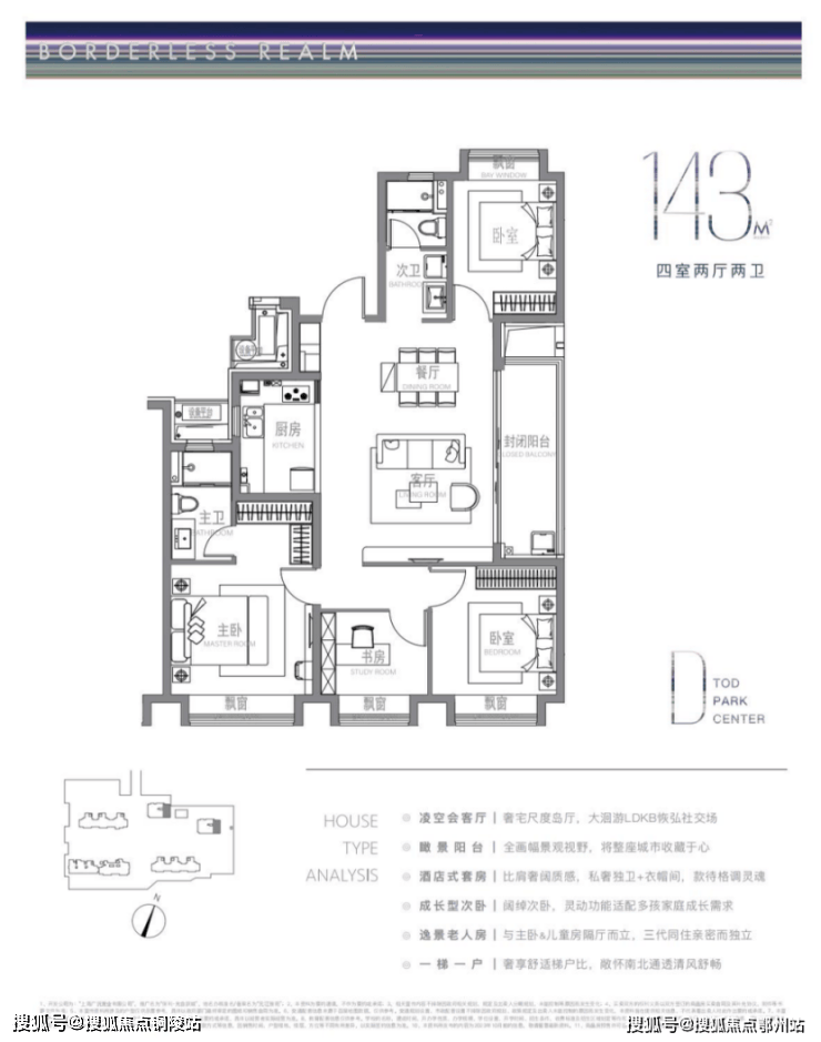建面约143m²户型特点: 超大画幅的岛厅,大洄游LDKB公区格局,IMAX级景观阳台,超奢观景视野,一梯一户尊享级梯户比,南北通透,尊崇感十足!