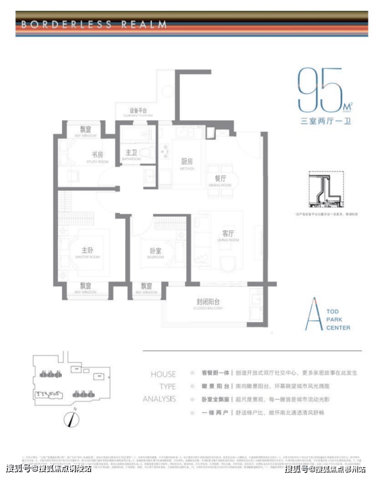 建面约95m²户型特点: 开放式厨房,极度释放厨房与客厅的尺度与互动可能,无连廊设计,一梯两户极致梯户比,南北通透舒适感