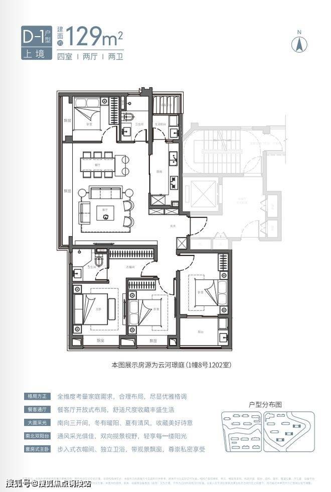 项目129平四房两厅两卫配置,功能齐全,满足终极置业需求;三开间朝南,向阳而居,6.1米侧厅布局,枕水而居,尽享滨水花园景观视野;开敞式书房,空间感升级,侧向飘窗,景观渗透更加充分。