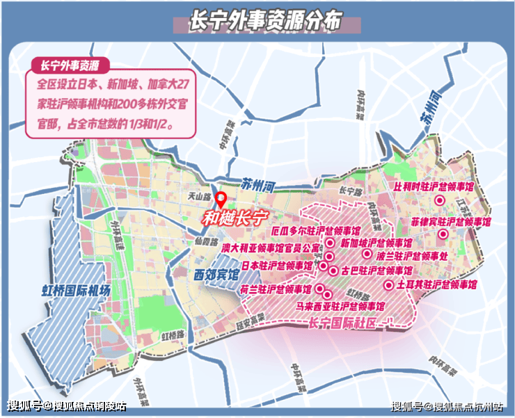 “外事客厅”的独一份定位,离不开长宁独一份的国际交通枢纽优势。作为全上海仅有与虹桥机场、高铁站“双枢纽”直接接壤的城区,其核心区域通过轨道交通、快速路网构建起“15分钟国际通勤圈”。
