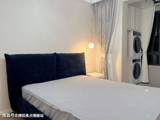 另一间卧室则以深墨绿软包床头碰撞浅灰床品,沉稳又耐看,球形吊灯的暖光落在床面,搭配简约白纱帘,营造出安静助眠的氛围。嵌入式收纳柜与洗衣区巧妙融合,既满足实用需求,又保持了空间的整洁通透,无论是自住还是待客,都能感受到松弛的舒适感。