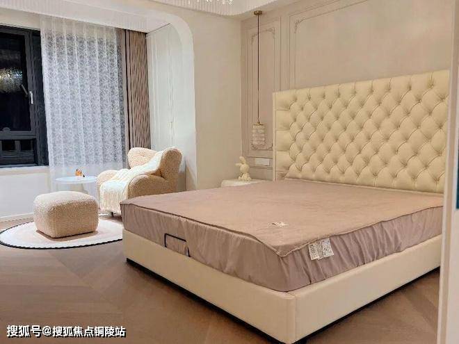 主卧以奶油白护墙与弧形线条奠定优雅基调,高定拉扣软包床头大气精致,垂坠感十足的玻璃吊灯为睡前时光镀上暖调柔光,窗边的泰迪绒单人椅与圆几,构成了专属的放松角落。通顶衣帽间兼顾收纳与通透感,让更衣、洗漱动线流畅高效,在静谧中藏着不费力的高级感。