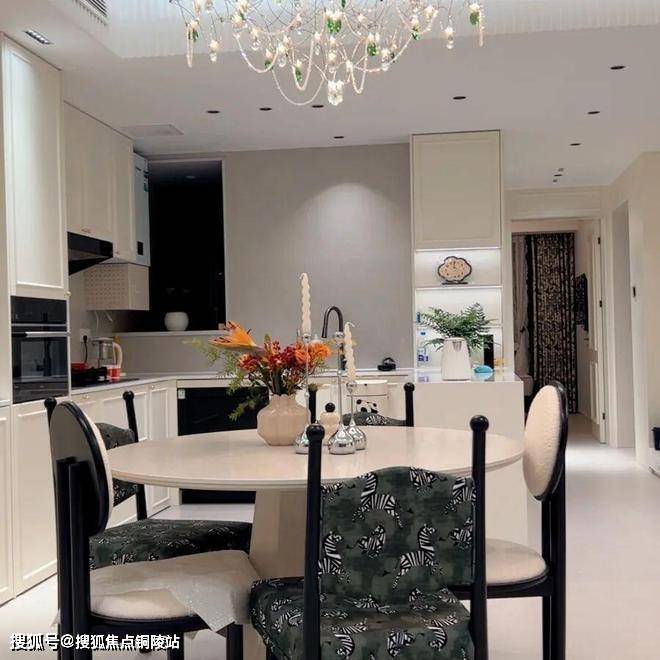 餐厅居于空间核心,串联起客厅与厨房,天然带着聚拢家人的温柔气场。圆形大理石餐桌搭配利落的几何桌腿,温润细腻,质感十足,搭配斑马纹复古餐椅,每一次落座都像赴一场浪漫的家宴。餐桌上方的水晶吊灯垂落着细碎光影,暖光轻裹着桌面,将三餐四季的烟火气与法式浪漫揉进每一次围坐里。