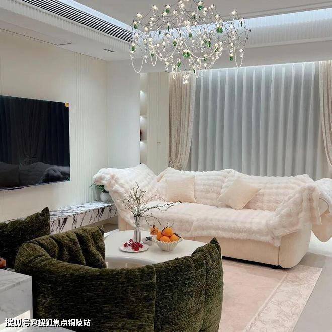 客厅以奶油白为基底,通刷暖调乳胶漆,搭配简洁法式石膏线勾勒轮廓,摒弃满墙雕花堆砌,于细节处藏着优雅。墨绿绒布单人椅柔软饱满,像被云朵轻轻包裹,搭配奶白色毛绒大沙发,低饱和色调碰撞间,让松弛感拉满。电视背景墙以天然大理石纹理点缀,利落又高级,悬浮式岩板电视柜兼顾收纳与美感,闲暇时窝在沙发里,看水晶灯光影流转,便是最治愈的日常。