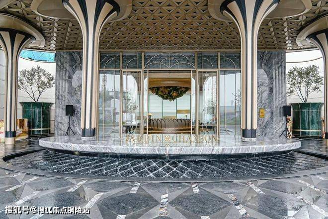 大门口的水景采用了龙鳞水纹的造型。在现场,会有种身处顶奢酒店入户大堂的观感。