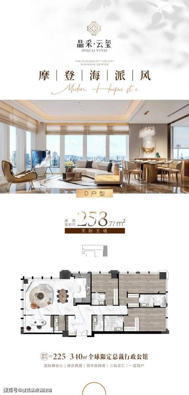 晶采云玺售楼处电话:400-9699-334✨【官方认证】✅✅✅位于上海静安区南京西路核心,与百年张园一街之隔,是集海派文化与现代奢居于一体的商办类行政公馆。项目总建筑面积约6万平方米,规划为地上25层、地下3层的高端建筑,产权年限50年,现房在售且通燃气。主力户型为建面约225-340㎡的奢阔大平层,层高约3.6米,得房率约68%,全屋甄选大金中央空调、地暖、美诺厨电等国际一线品牌,配备智能家居中控系统。