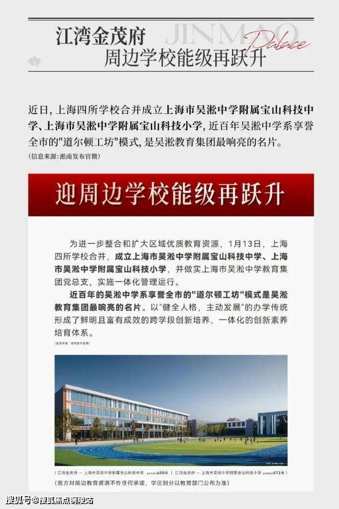 4、优质教育集群,是价值最深厚的“压舱石” 当板块内的教育资源通过战略合并与整合实现能级跃升,其带来的不仅是教育选择的优化,更是区域价值的深层加固。优质学校的聚集,始终是资产穿越周期最坚实的保障,为社区提供着持续而稳定的内生动力。上海四所学校合并成上海市吴淞中学附属宝山科技中学、上海市吴淞中学附属宝山科技小学两所重点学校,这将为江湾金茂府的未来价值提供重要支撑。