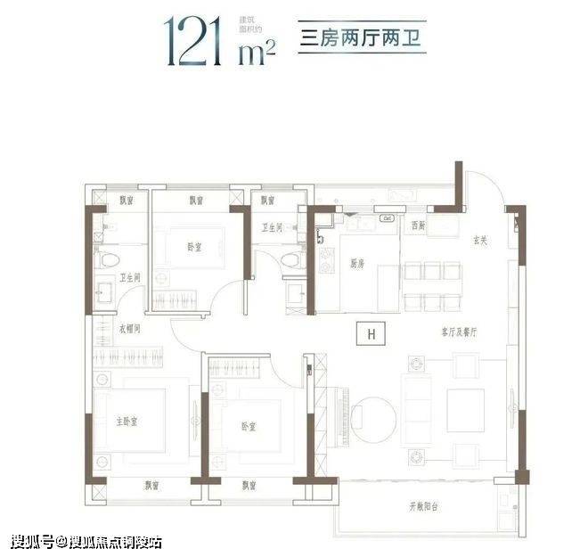 户型特点:3开间朝南,全屋阳光充足;L型厨房转角移门设计,最大化空间视野;四飘窗设计,通透空间享受;动静分区,亲密有度;套房式主卧,容纳私谧生活点滴;