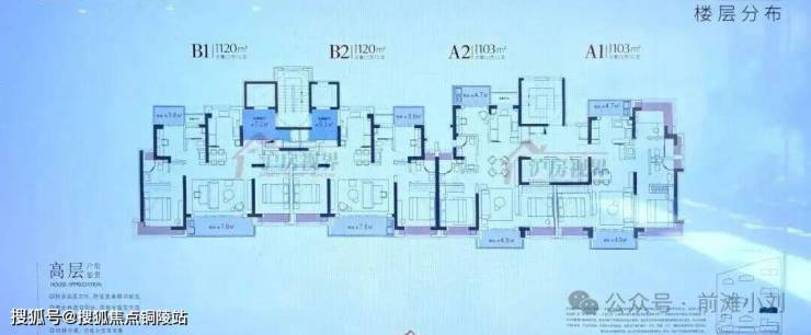 户型建筑层高3.1-3.15米,无连廊,双阳台配置。其中建面约103平户型2梯2户,其余一梯一户。