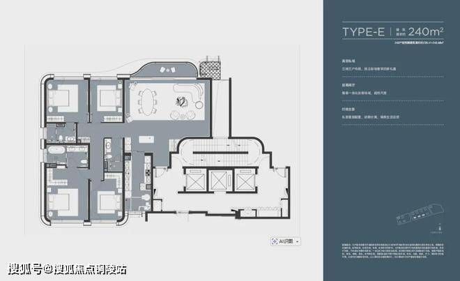 建面约240㎡户型,中低区总价约3500-4000万。如果说约180㎡户型解决的是“占位”,那约240㎡户型解决的,就是真正舒舒服服住进去。这一档很像五批次里的“隐形优等生”。它未必最有话题度,但很可能是最稳的一档。因为它几乎踩中了高净值家庭最现实、也最长期的居住需求:
