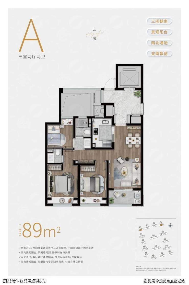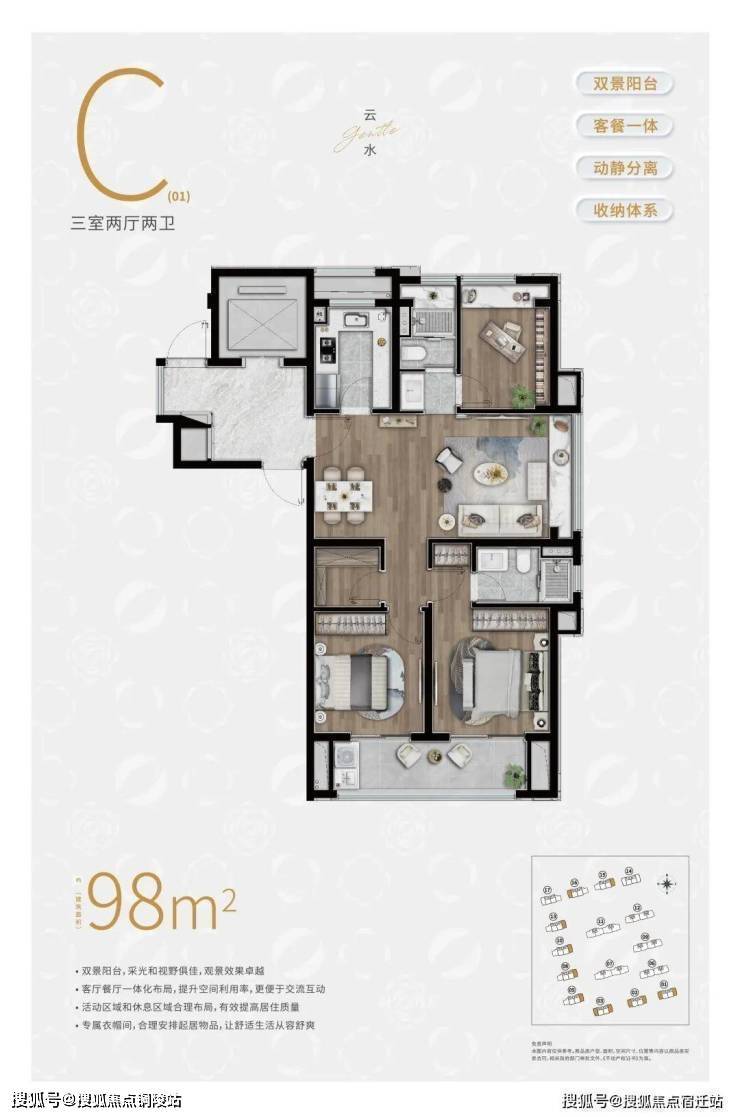 约98㎡3房2卫户型,三开间朝南,并且这贯穿客厅+次卧的超大阳台实在是惹眼,这个南向的视野延展度以及采光度相比同级别的户型来说,要更加出色.