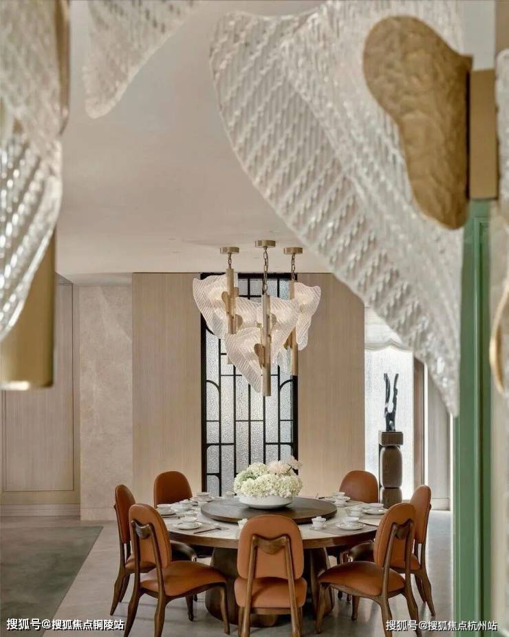 餐厅的设计巧妙融合了老上海的经典元素,圆形餐桌和橘色皮质餐椅在色彩上既现代又充满活力,顶部的水晶吊灯造型灵感来自上海市花“玉兰花”,既增添了空间的华丽感,又巧妙地融入了上海的地域特色。