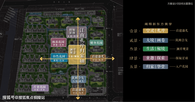 以江南人文精神为源点,打造两轴一环五进空间,江南礼序归家轴串联启迎盛礼、筑阙会友、归家华堂等5重礼制,尊崇归家;健康运动轴以24小时跑道为社区活力生活环,串联儿童乐园、长者康养、疗愈花园等10大生活场景,营造全龄全时的江南诗意生活。