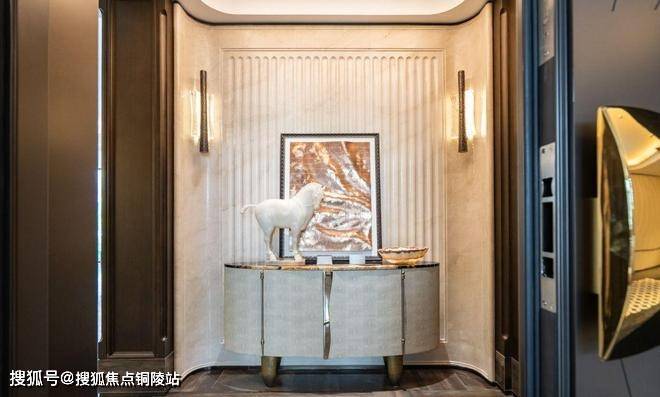 电梯厅的宠物识别按钮是艺术家定制款;入户门把手出自艺术家刘建华之手,用整块实心铜锭经锻造、打磨、电镀等多道精密工艺制成,握住的瞬间就是与艺术的触碰