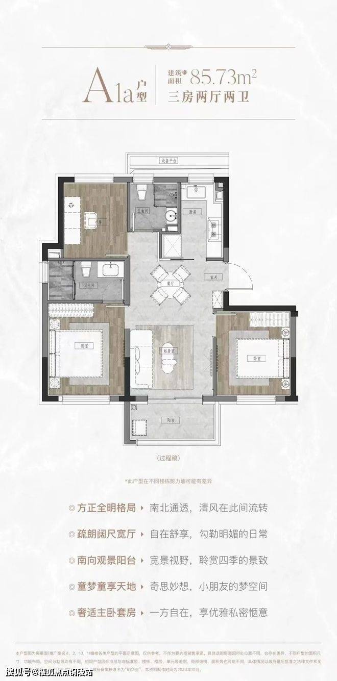 区别于市面上80多平2房或3房1卫,该户型做出了3房2卫的格局,功能性拉满,满足三代同堂/二胎家庭共居。