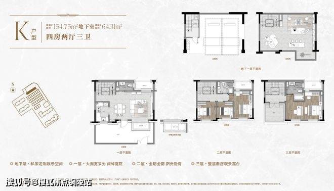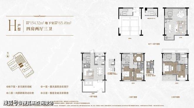 一楼和地下室主社交和志趣,二楼是子女的房间,三楼是主人休憩区。
