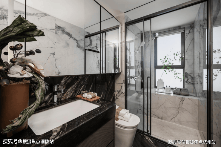 卫浴墙面采用寒江雪大瓷砖铺装,淋浴部分地面选用整块天然大理石。
