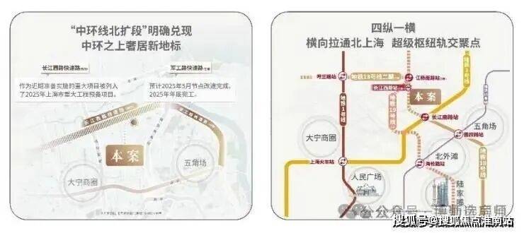 地铁18号线二期(在建)将原本不完全相连相交的地铁1号线、3号线、19号线(在建)横向拉通,北上海轨交因此互联,淞南将成为区域轨交的聚点;同时,本案近邻长江西路地铁站(直线距离约150米),咫尺杨浦背靠江湾,畅达淞南小五角场,1站江杨南路、5站复旦大学、7站五角场,便捷通联。