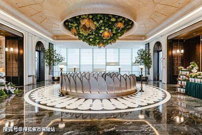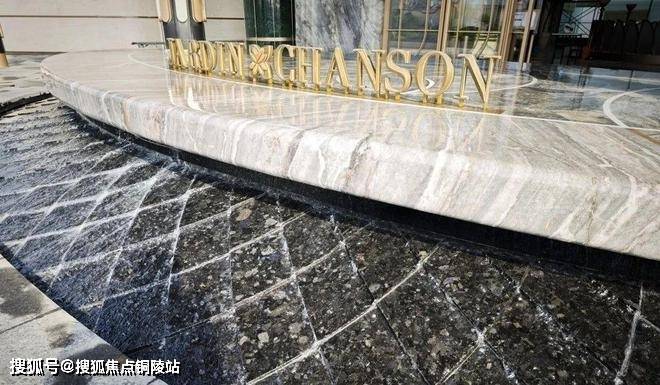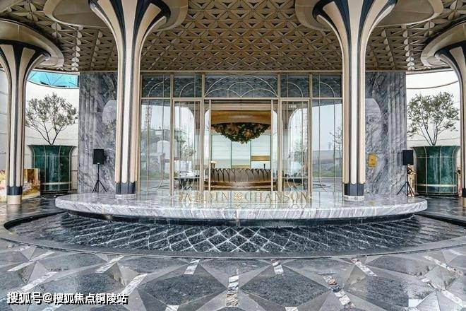 大门口的水景采用了龙鳞水纹的造型。在现场,会有种身处顶奢酒店入户大堂的观感。