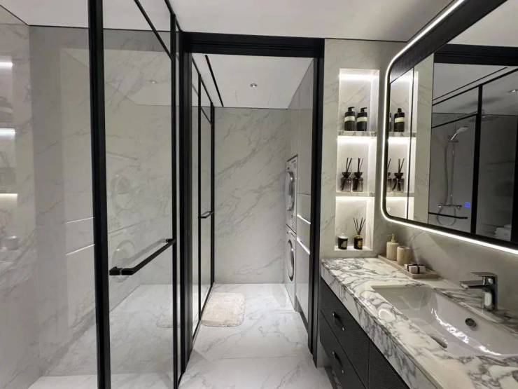 ✔卫生间地面和墙面整体性也非常强,奢石台面的纹路和岩板墙面和协调。