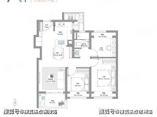 建面约 89㎡潮奢三房:三开间朝南,餐客一体化连接全景阳台,全屋采光充足,超高得房率,动线合理,创新收纳体系,完美适配三口之家。