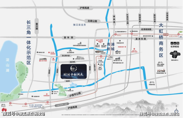 轨道交通 :项目距地铁 17 号线淀山湖大道站直线距离约 2 公里,多条公交线路可直达地铁站,乘坐 17 号线可无缝串联青浦新城、虹桥商务区及上海核心城区,至虹桥火车站仅需 30 分钟,至人民广场约 1 小时,换乘 2 号线、10 号线即可通达上海各个区域,满足日常通勤需求 [13]。更值得期待的是,规划中的示范区线朱家角站预计 2028 年通车,站点距社区步行约 800 米,未来可直达苏州、昆山,真正实现 “上海全域覆盖 + 长三角一小时通勤圈”,为跨城工作、生活的人群提供极大便利 [17]。